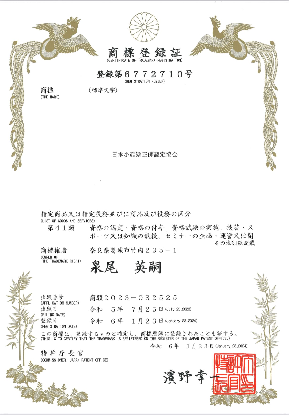 当協会 泉尾英嗣の商標「日本小顔矯正師認定協会」は日本国家に登録された商標です。