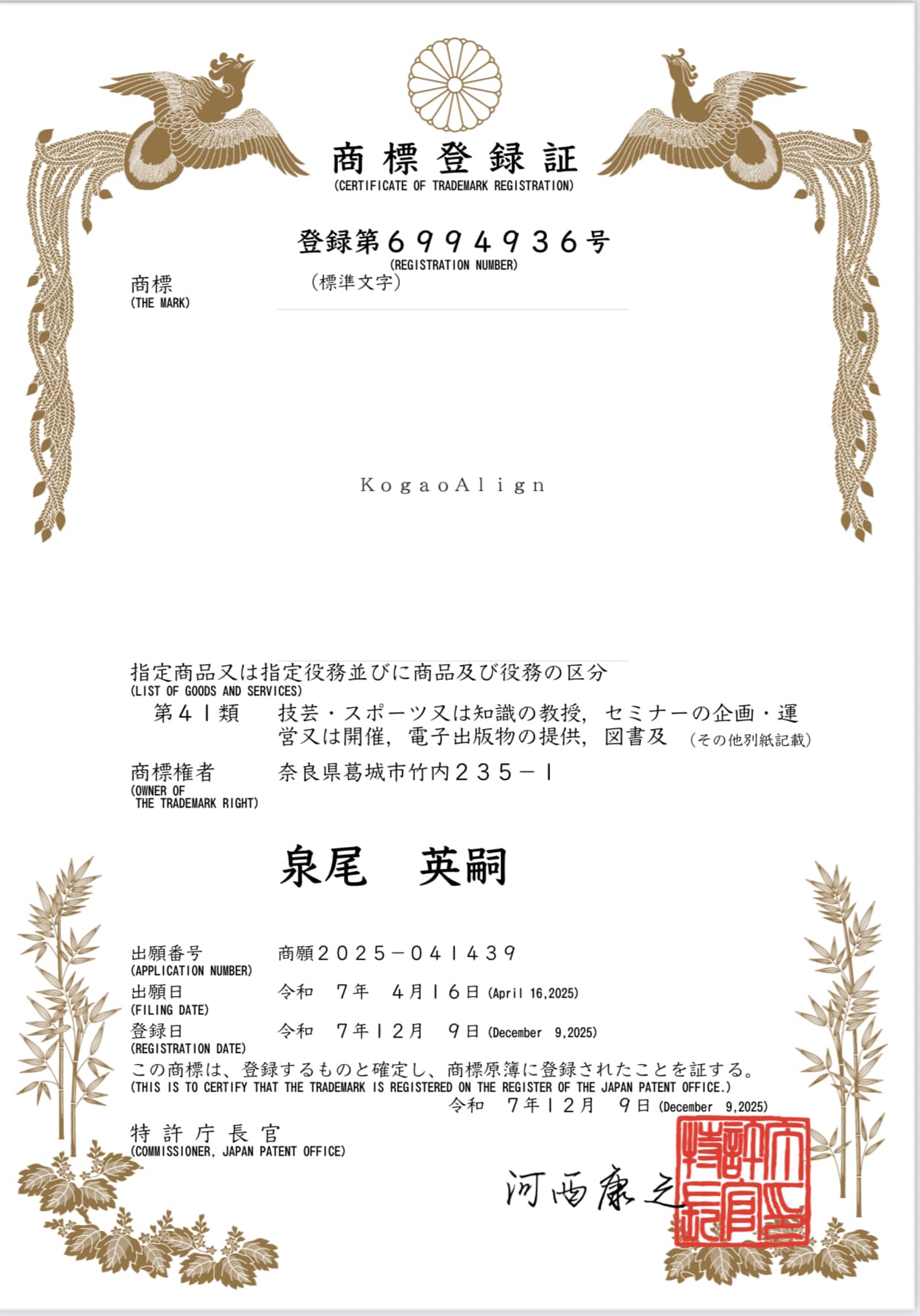 当協会 泉尾英嗣の商標「KogaoAlign」は日本国家に登録された商標です。